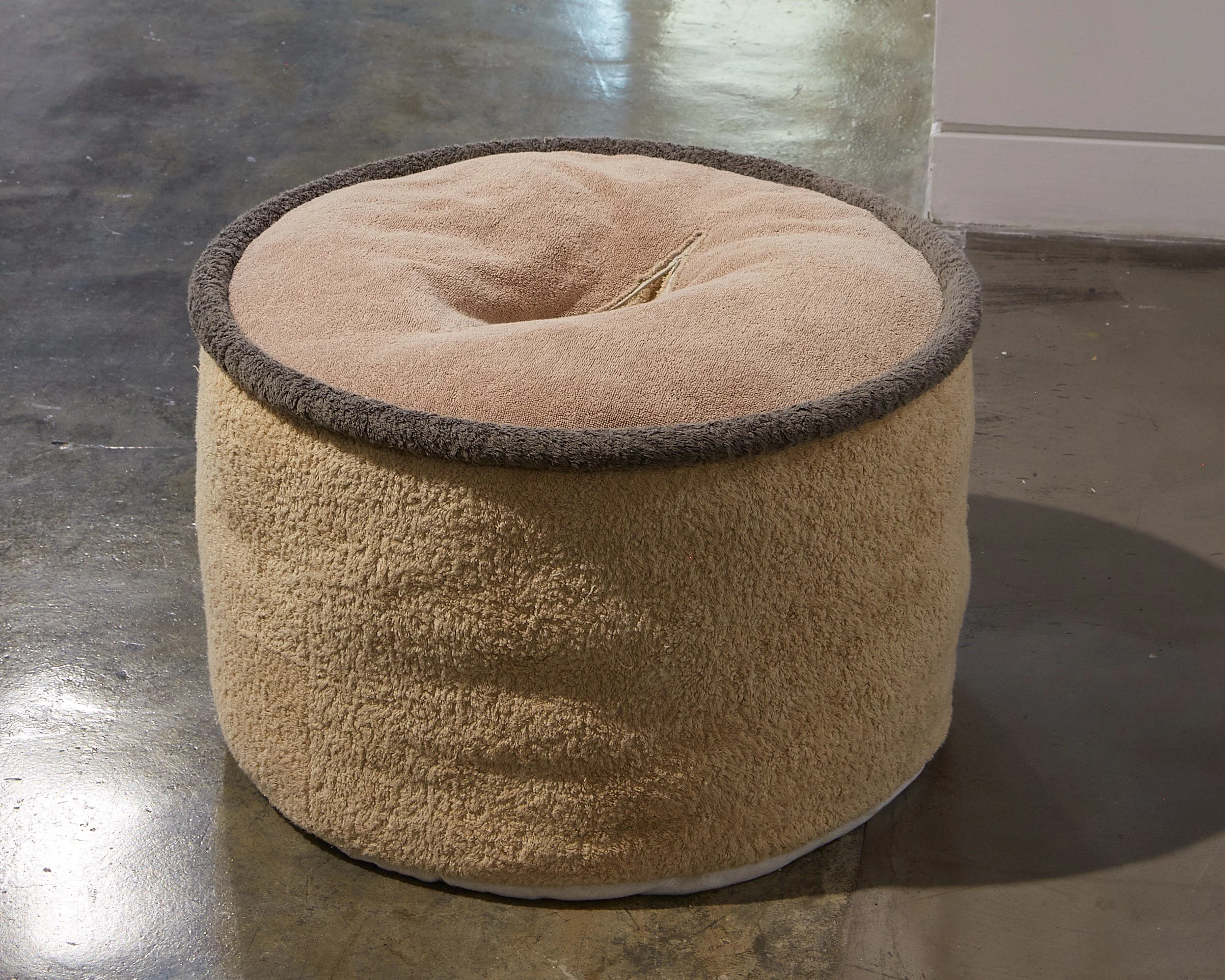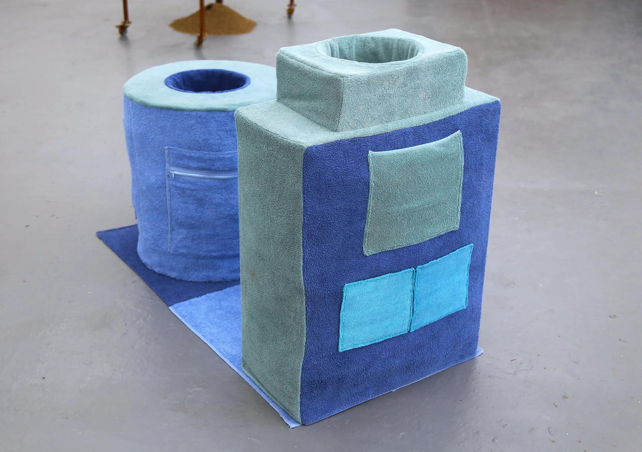 towels, polyester stuffing, wood and metal table frames, upholstery foam, cardboard